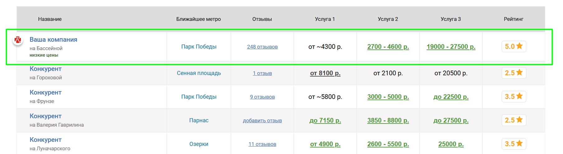 агентств, продвигаемое агентство попадёт к ним в таблицу «Сравнение по ценам», которая выглядит следующим образом:
